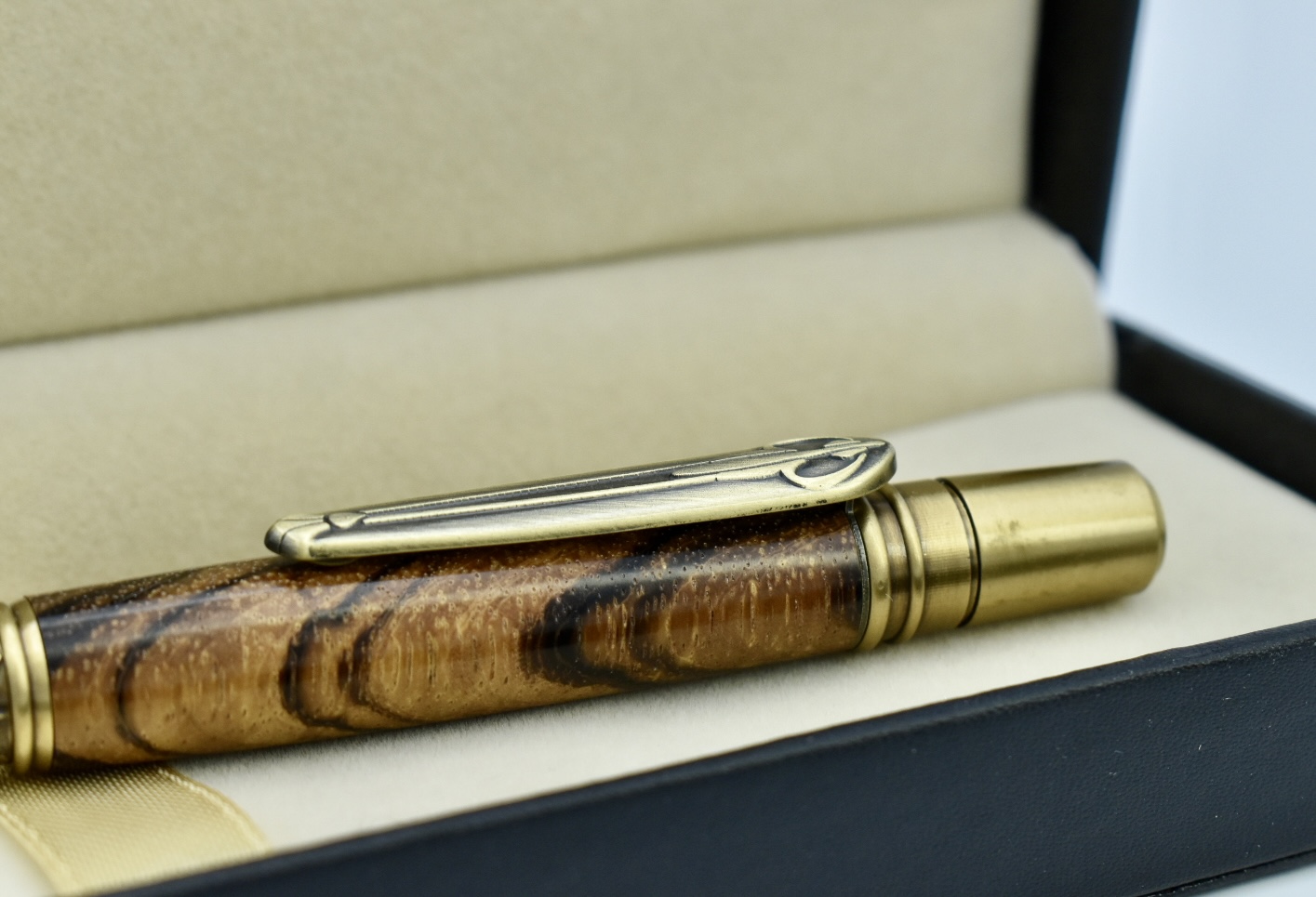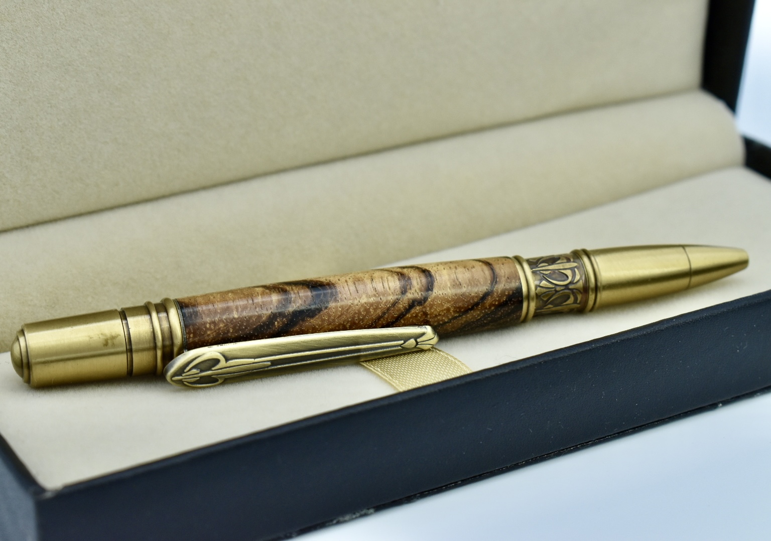 Looking for something different? Antique brass components with exotic, Zebrano wooden body. The finish is Melamine which is extremely tough, heat and water resistant, then finally, a top coat of carnauba wax to minimise fingerprints. Supplied in a black leatherette gift box with added pen pouch to keep it safe on travels.