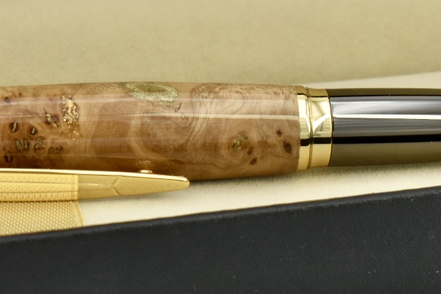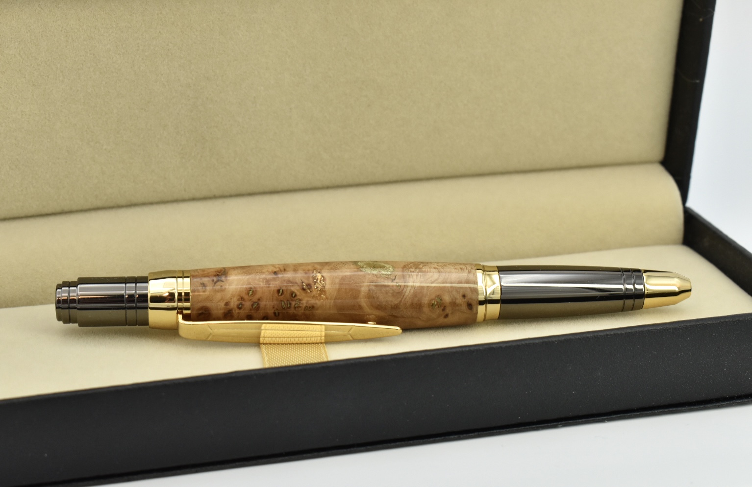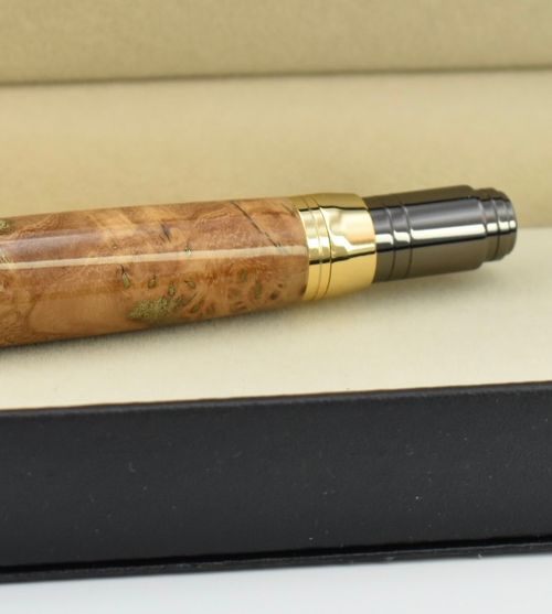 Beautiful ballpoint pen in gunmetal with upgraded gold accents. Inside is a Parker type G2 refill. The body is Ash burl with brass and gold metal leaf inclusions. The finish is cyanoacrylate polished to a high gloss finish. Complete with gift box and pen pouch.