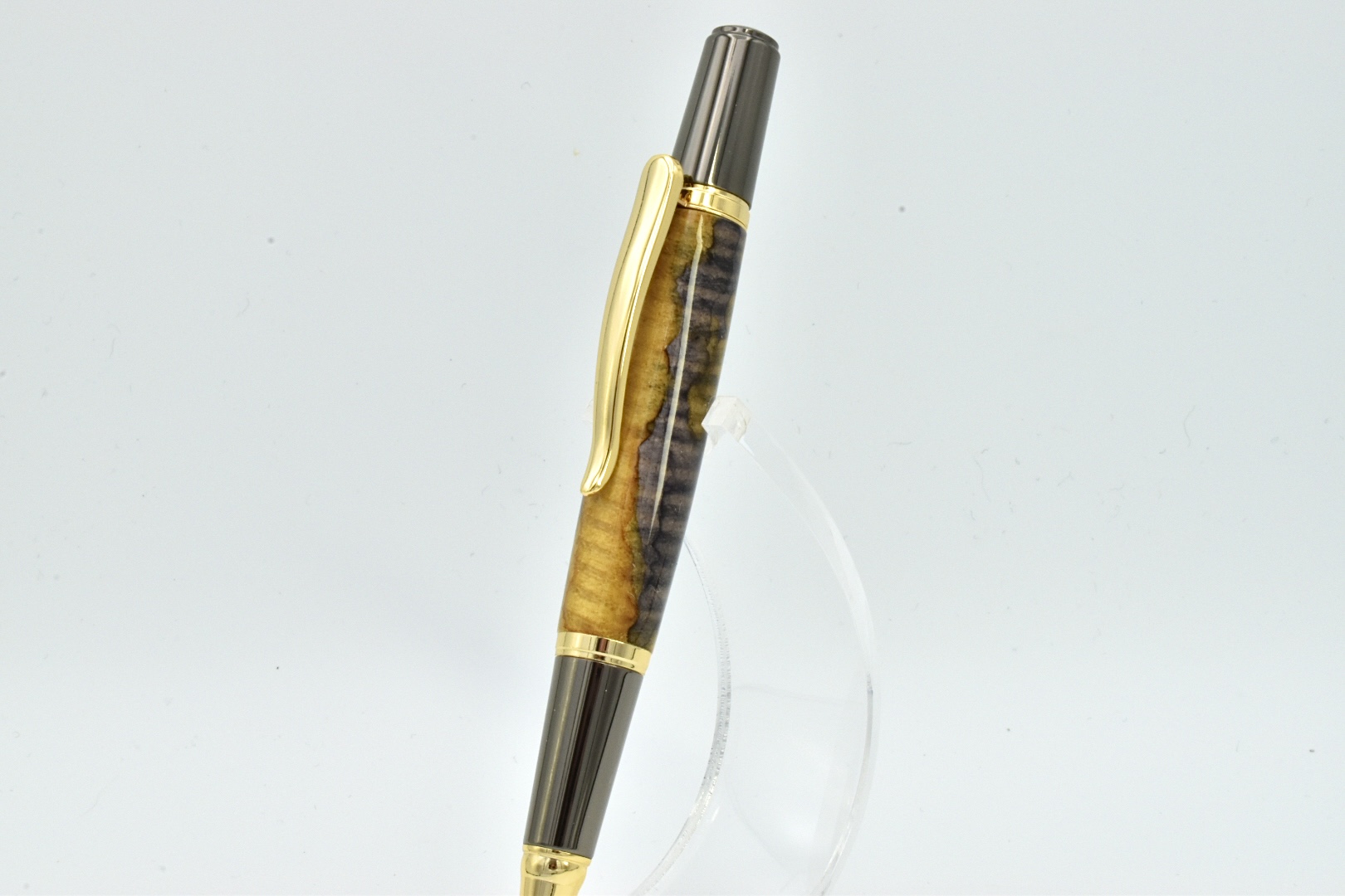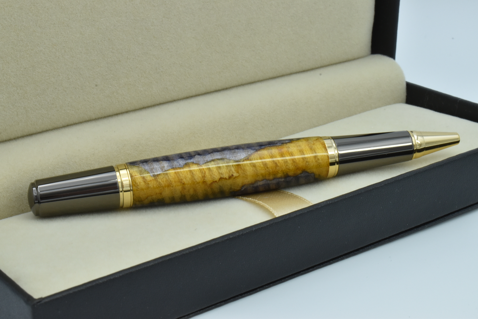 Ballpoint pen with dyed ash wooden body. The components are gunmetal with upgraded gold accents. Inside is a Parker type G2 refill. The Ash has been cut at an angle to open the grain up. Definitly unique as I've only made this one. I was inspired by the Ukraine flag but I'm colour blind so not really sure how successful that was.