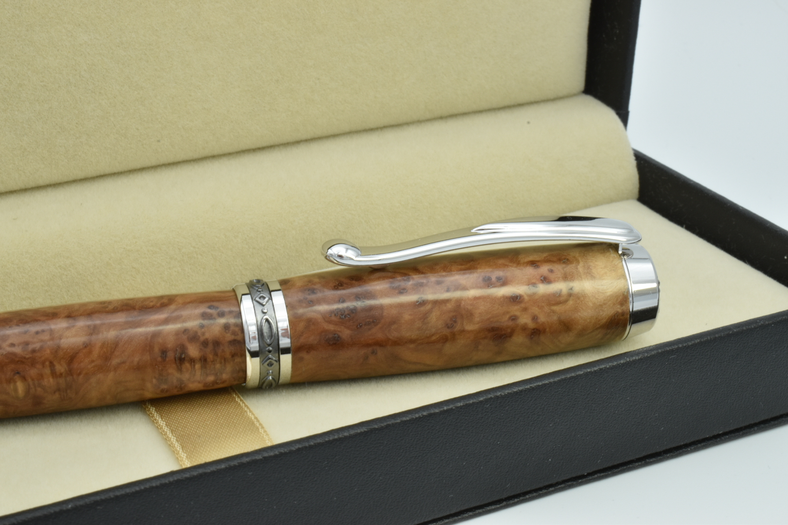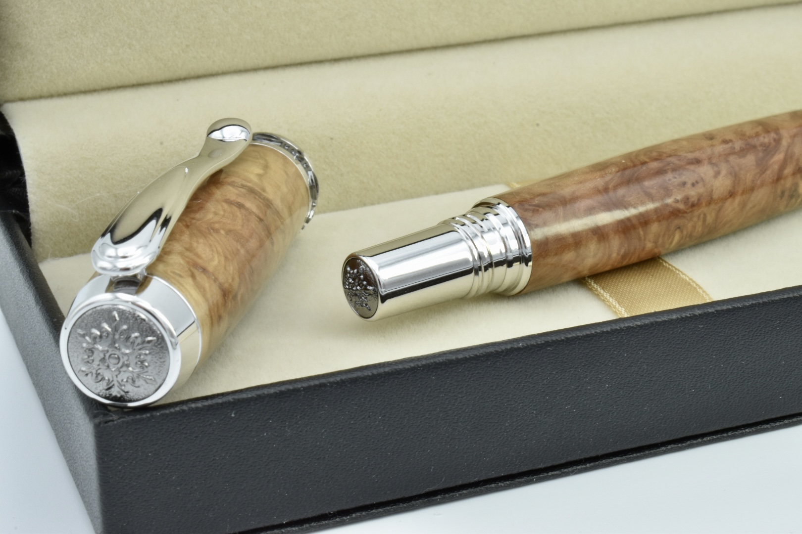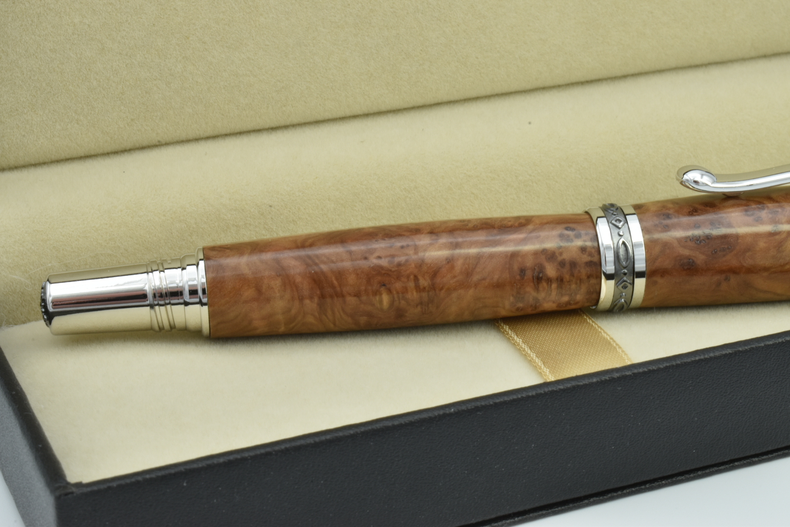 This rollerball style is no longer available in rhodium platings as it's now been replaced with chrome. Rhodium is a luxury plating used in the jewellery trade, so this is one of only a few I have left. The accents are Black Titanium and the body is Rib Fruited Mallee burl, an exotic timber from Australia, finished with melamine. The result is an incredibly, regal, magnificent and rare writing treasure. Inside is a Schmidt rollerball refill with ceramic nib. Supplied in a deluxe gift box.