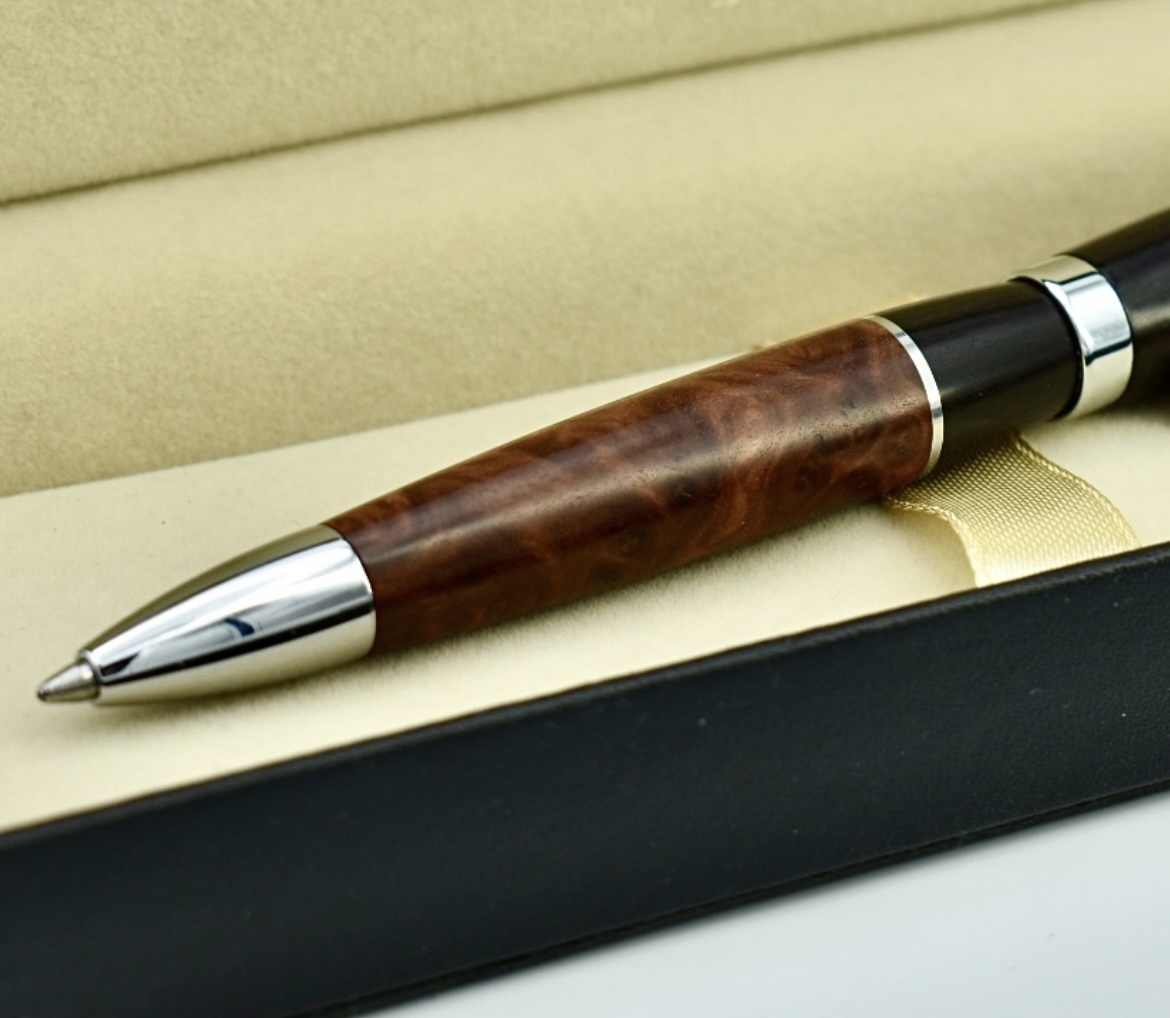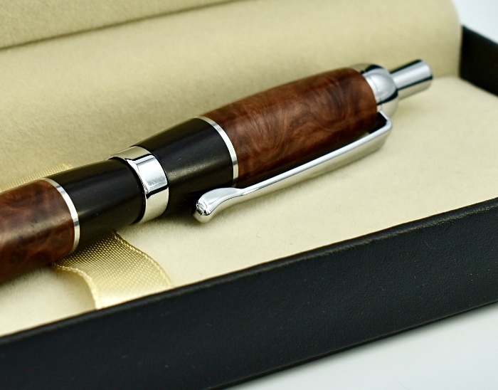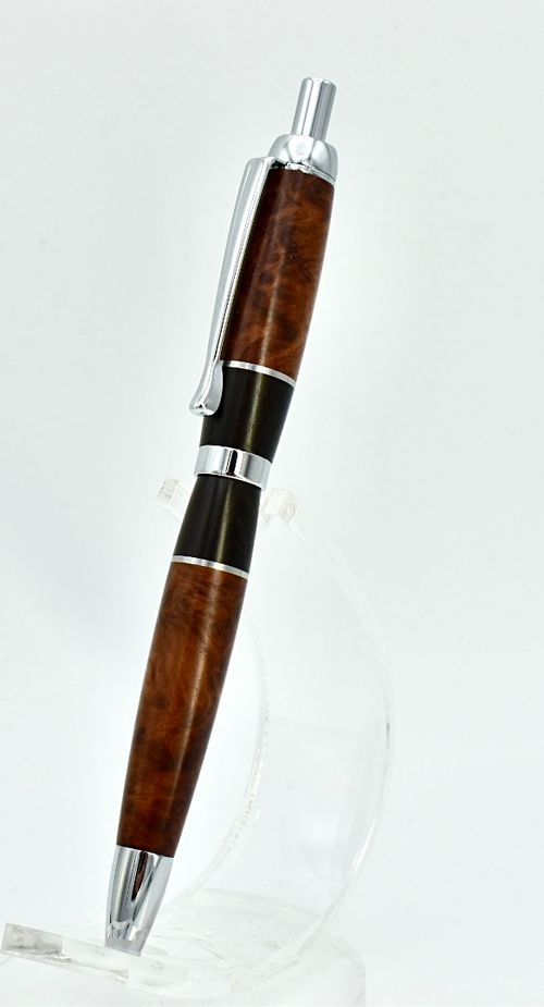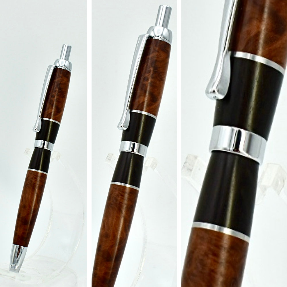Unique, ballpoint pen with click mechanism. Chrome components with Australian Red Mallee Burl, African Blackwood and aluminum accents. Inside is a Parker type G2 refill. The click mechanism on this pen is trusted and reliable. A real conversation piece and perfect gift idea.